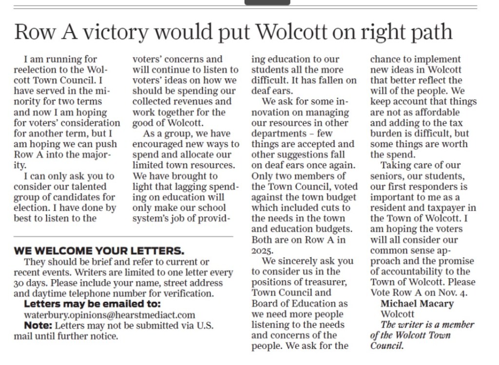 Paid for by the Wolcott Democrat Town Committee, Approved by Robert Ficeto, Treasurer.